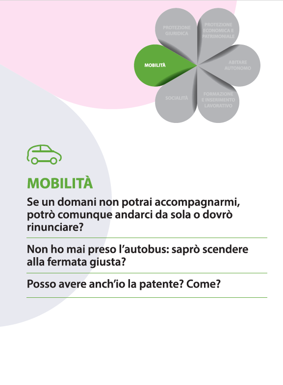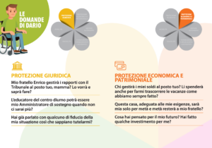 Non è semplice parlare di disabilità, soprattutto quando si affrontano domande dolorose come: “Cosa accadrà a mio figlio quando non ci sarò più?” Abbiamo quindi pensato a delle domande che due nostri alter ego con disabilità, Viola e Dario, pongono ai loro familiari per ognuno degli ambiti di cui si compone il Dopo di Noi: protezione giuridica, protezione economica e patrimoniale, abitare autonomo, formazione e inserimento lavorativo, socialità, mobilità.